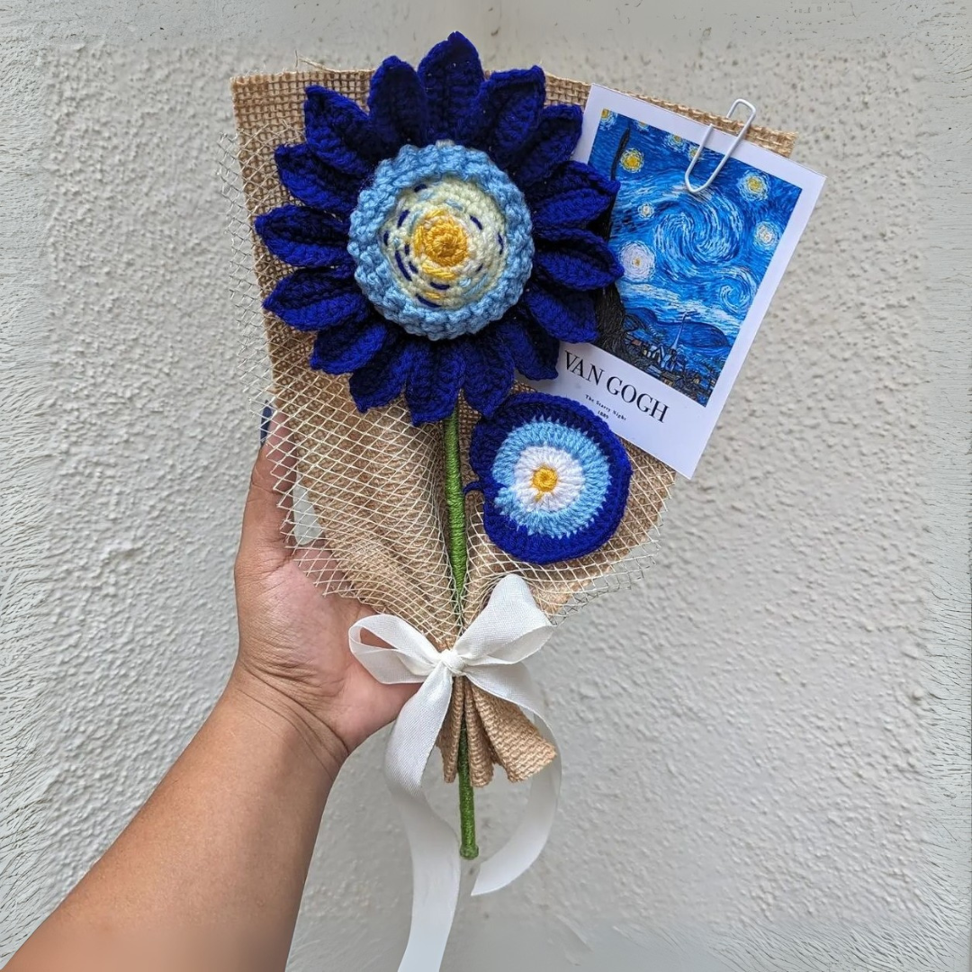 The center of this sunflower mimics the swirling textures of Van Goghโ€™s iconic Starry Night painting. Comes with a matching mini art card, wrapped in kraft brown paper.