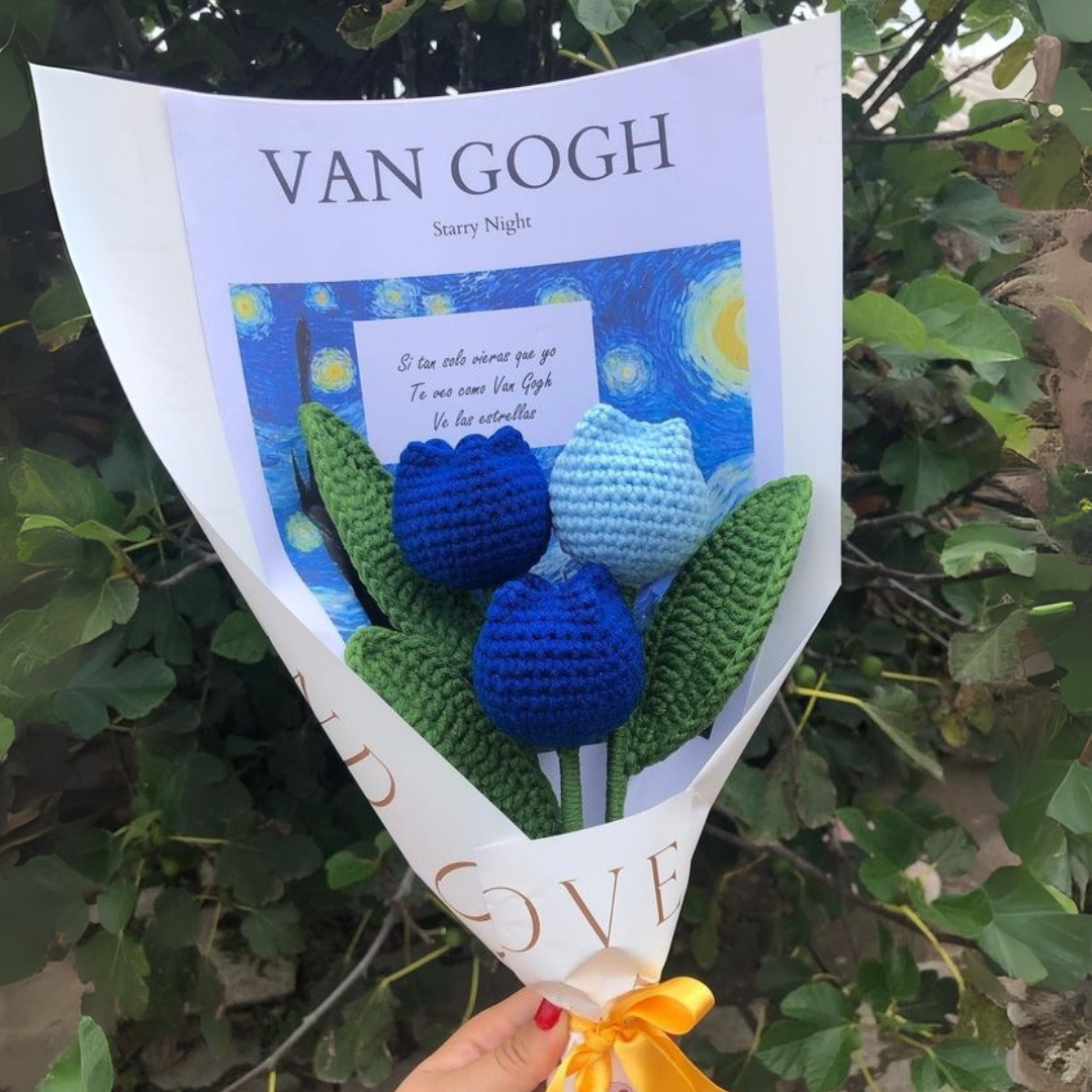 Starry Tulip Night Bouquet draws inspiration from Van Gogh?s masterpiece ?Starry Night,? featuring three tulips in dreamy blue shades. Wrapped with a print of the painting and white paper, this bouquet merges art and nature beautifully. Perfect for art lovers and dreamers alike, it requires gentle care and dryness.