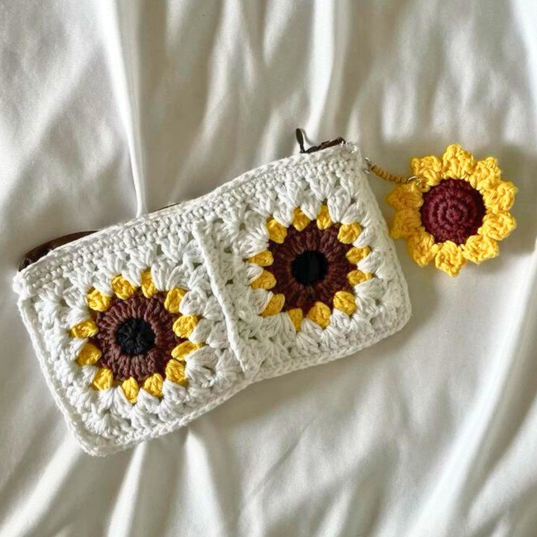 White base pouch with sunflower charm zipper pull. 7×3.5 inches.